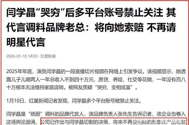 虽然佐香园的声明中没有提及向闫学晶索赔的事情,但根据行业惯例和签订的合同,佐香园对闫学晶的索赔,闫学晶逃不掉。 不难猜测,这些赔偿会让闫学晶肉疼,而她也害怕其他代言品牌和她也解约。 值得一提的是因为哭穷,闫学晶不仅自己付出了惨重的代价,把儿子林傲霏也连累了。