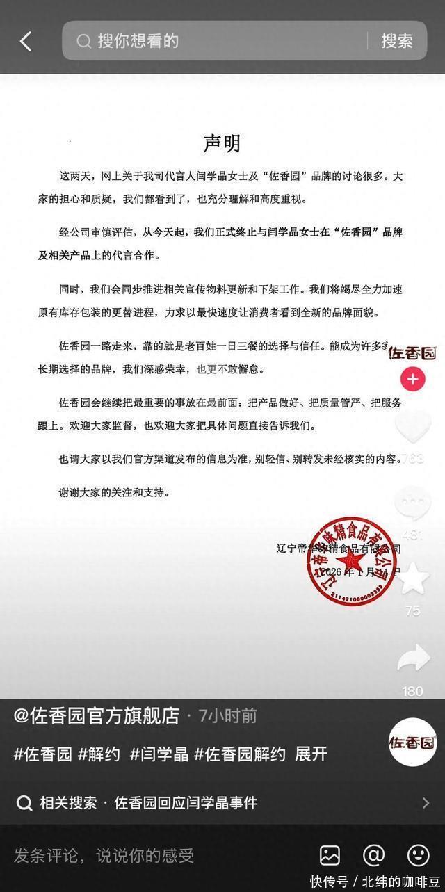 对于闫学晶而言,这是一个巨大的噩耗,意味着她要向品牌方进行巨额赔偿。 但这并不是结束,1月11日,佐香园品牌发布了声明,声明中写道从1月11日起佐香园正式和闫学晶结束合作。