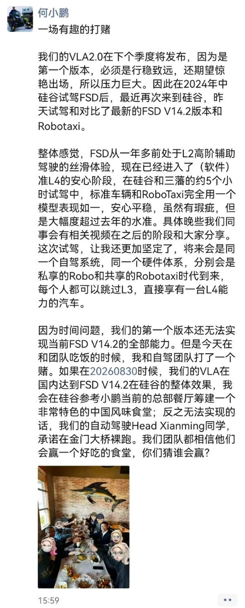 但他跟自驾团队打赌:如果到2026年8月30日,小鹏VLA在国内成功达到特斯拉FSD V14.2在硅谷的效果,那他就在硅谷建一家中国风味食堂;
