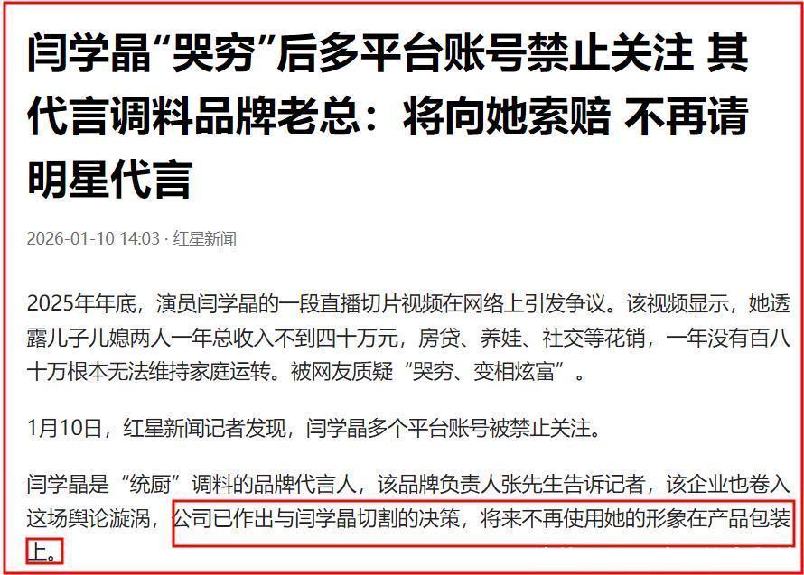 有2家品牌及时与闫学晶做出切割,停止与她的合作,其中一家品牌明确表示会向闫学晶索赔。